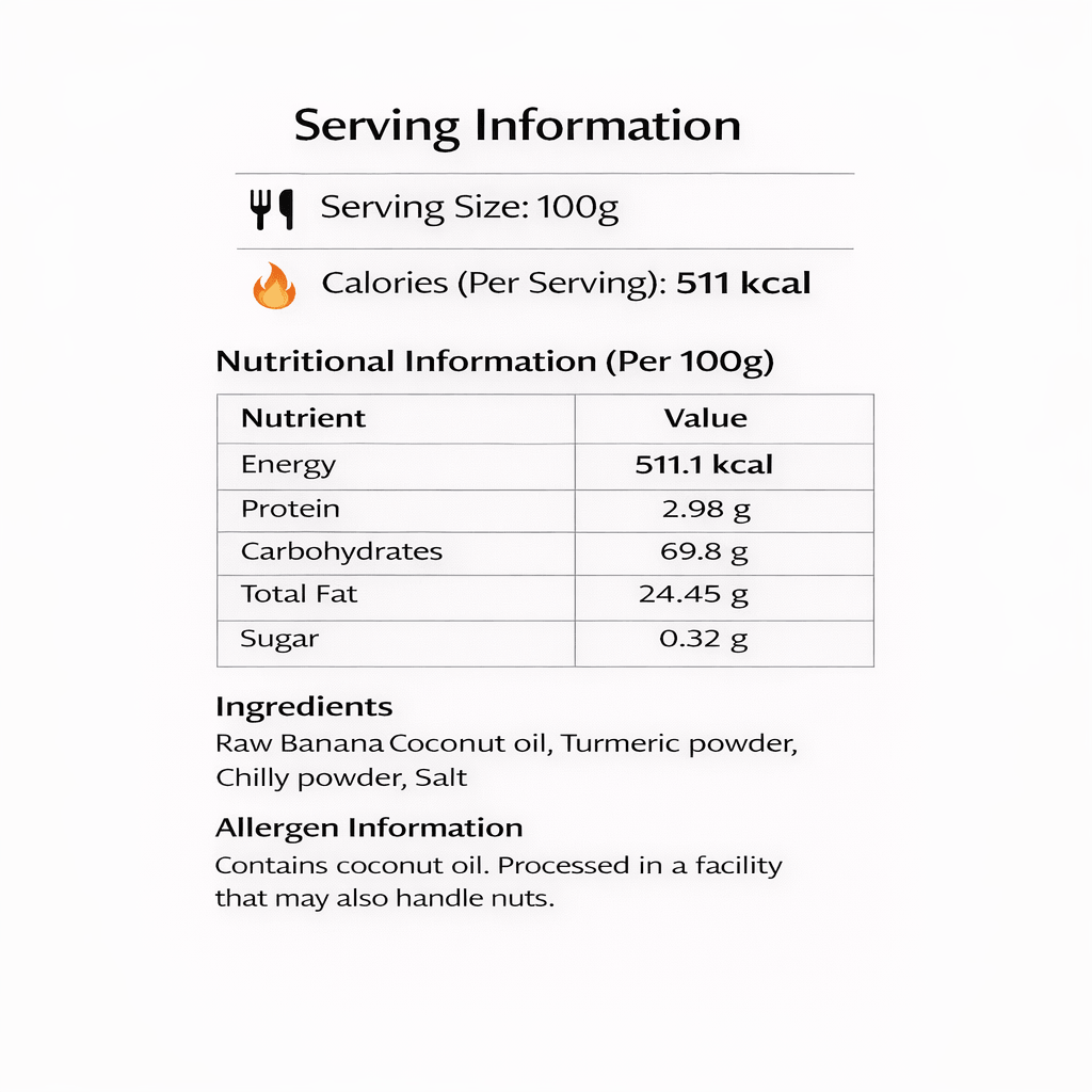 • Ingredients – Raw banana, Coconut oil, Chilly Powder, Salt