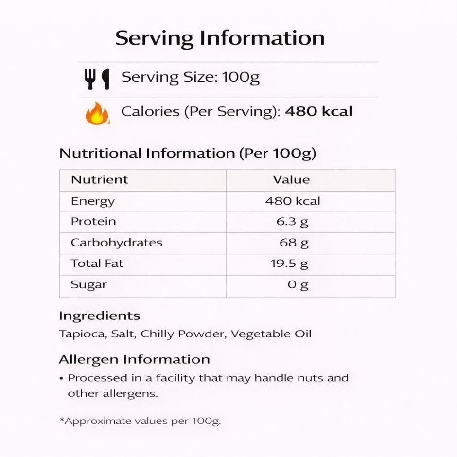 - Ingredients – Tapioca, Vegetable oil, Chilly Powder, Salt